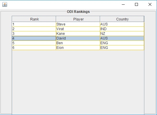 }輸出如下。此處,我們選擇了一行。現在,我們可以選擇一行,因為 setRowSelectionAllowed() 在上面設定為 TRUE −