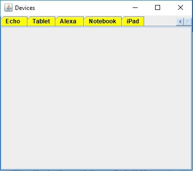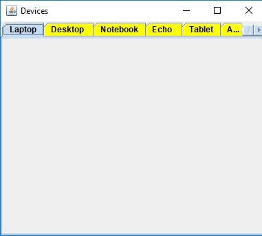package my; import javax.swing.*; import java.awt.*; public class SwingDemo { public static void main(String args[]) { JFrame frame = new JFrame("Devices"); JTabbedPane tabbedPane = new JTabbedPane(); JTextArea text = new JTextArea(100,100); JPanel panel1, panel2, panel3, panel4, panel5, panel6, panel7, panel8; panel1 = new JPanel(); panel2 = new JPanel(); panel2.add(text); panel3 = new JPanel(); panel4 = new JPanel(); panel5 = new JPanel(); panel6 = new JPanel(); panel7 = new JPanel(); panel8 = new JPanel(); tabbedPane.setBackground(Color.yellow); tabbedPane.setForeground(Color.black); tabbedPane.addTab("Laptop", panel1); tabbedPane.addTab("Desktop ", panel2); tabbedPane.addTab("Notebook", panel3); tabbedPane.addTab("Echo ", panel4); tabbedPane.addTab("Tablet", panel5); tabbedPane.addTab("Alexa ", panel6); tabbedPane.addTab("Notebook", panel7); tabbedPane.addTab("iPad", panel8); tabbedPane.setTabLayoutPolicy(JTabbedPane.SCROLL_TAB_LAYOUT); frame.add(tabbedPane); frame.setDefaultCloseOperation(JFrame.EXIT_ON_CLOSE); frame.setSize(400,350); frame.setVisible(true); } }