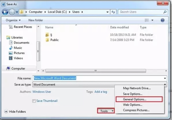 步驟 3 - 命名和選擇位置後,在文件名稱部分下方有一個名為“工具”的選項。單擊“工具”選項並選擇“常規選項”。