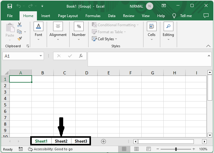 首先,選擇您想要輸入相同資料的那些工作表。要一次選擇多個工作表,請按住Ctrl鍵,然後單擊這些工作表。