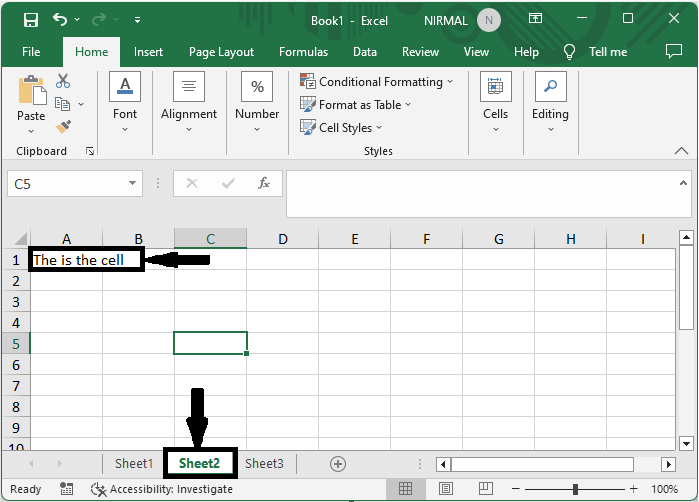 在這裡,我們將首先選擇工作表,然後在單元格中輸入文字。讓我們來看一個簡單的過程,瞭解如何在Excel中一次性將相同的資料輸入多個工作表。