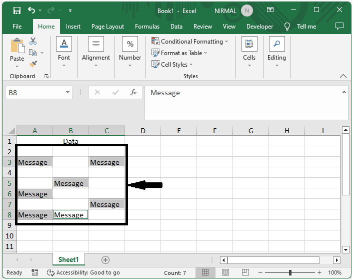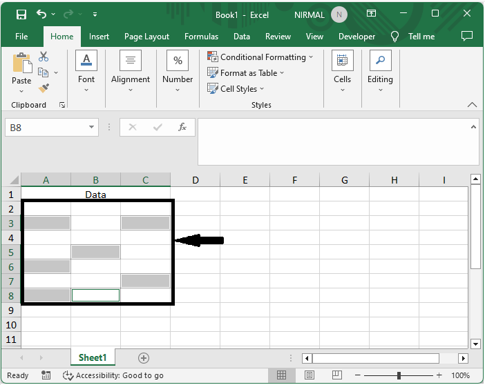 在這裡,我們將首先選擇單元格,然後輸入資料來完成任務。讓我們來看一個簡單的過程,瞭解如何在Excel中一次性在多個單元格中輸入相同的資料或公式。