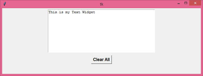 我們假設在應用程式中建立了文字小元件。現在,要清除文字小元件,我們可以使用 delete("1.0", END) 方法。它可以在回撥函式或透過 Button 類物件觸發的事件中呼叫。