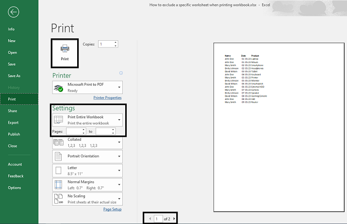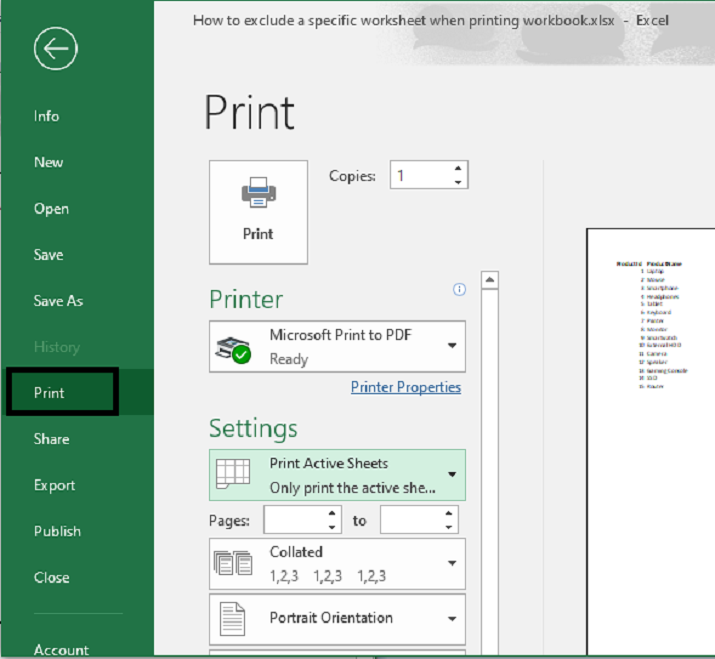 隱藏所有必要的工作表後,轉到“檔案”或“列印”選單,並選擇您喜歡的列印設定。