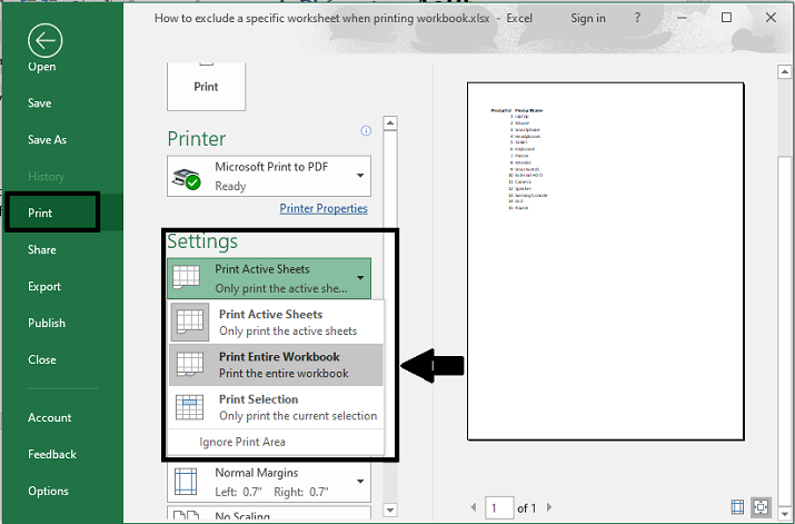 在列印設定中,您可以在下方看到並列印整個工作簿中顯示的工作表,但不會列印隱藏的工作表。