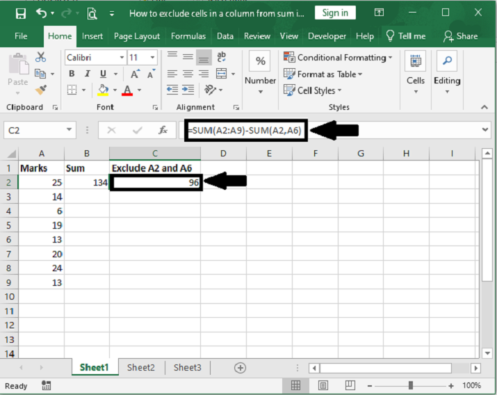 按回車鍵計算總和。結果將是指定範圍的總和減去排除的單元格的總和。