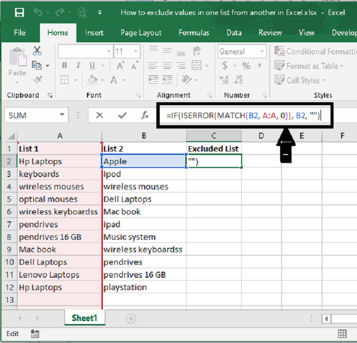 此公式使用 MATCH 函式檢查單元格 B2 中的值是否存在於列表 1(A 列)中。如果找不到匹配項,則返回錯誤。然後,ISERROR 函式檢查是否存在錯誤。如果沒有匹配項,則返回列表 2(單元格 B2)中的值;否則,返回空字串。
