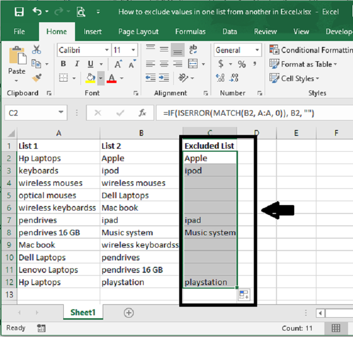 在生成的 C 列中,列表 2 中存在於列表 1 中的值將被排除,而列表 1 中不存在的值將保留。