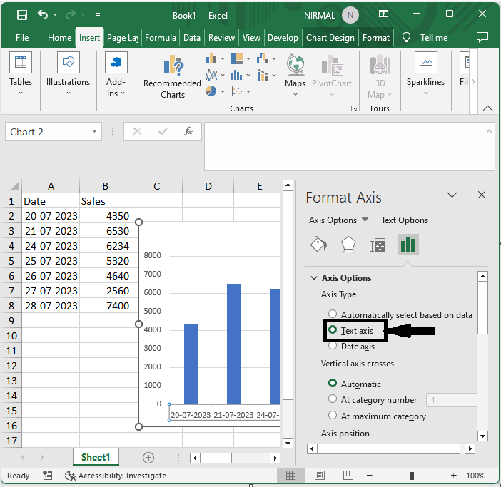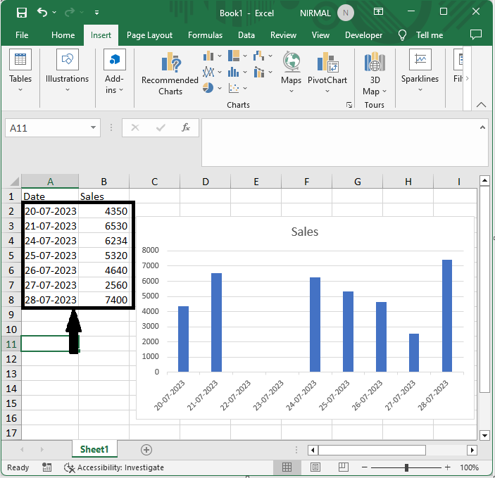在這裡,我們將格式化軸來完成任務。讓我們來看一個簡單的流程,瞭解如何從Excel中的日期軸中排除週末。