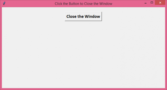 # Import the library from tkinter import * # Create an instance of window win = Tk() # Set the geometry of the window win.geometry("700x350") # Title of the window win.title("Click the Button to Close the Window") # Define a function to close the window def close(): #win.destroy() win.quit() # Create a Button to call close() Button(win, text= "Close the Window", font=("Calibri",14,"bold"), command=close).pack(pady=20) win.mainloop()