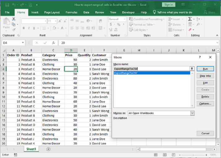 按 Alt+F8 開啟宏對話方塊。選擇 ExportRangeToCSV 宏並點選執行。