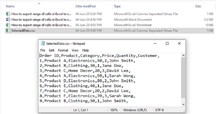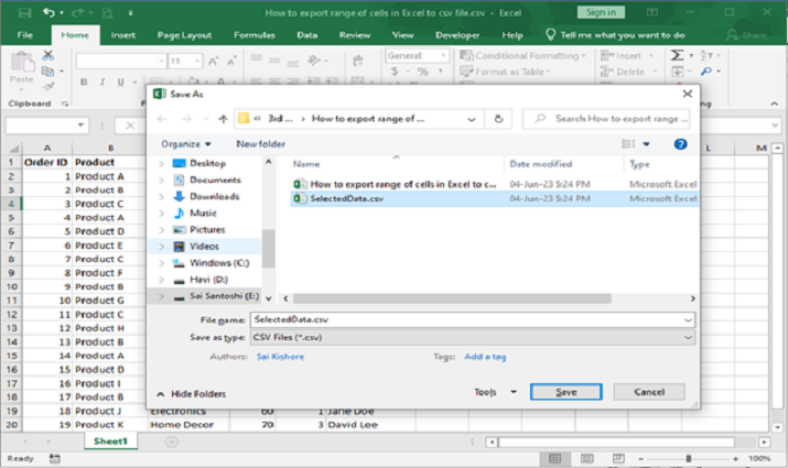 選擇區域並點選確定後,程式碼將提示“另存為”對話方塊,您需要在其中輸入檔名和要儲存 CSV 檔案的所需位置,預設“儲存型別”為 CSV 檔案。