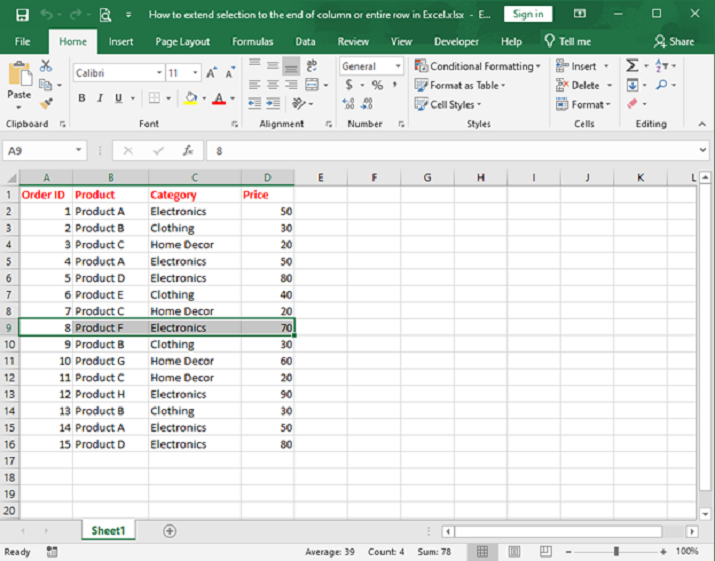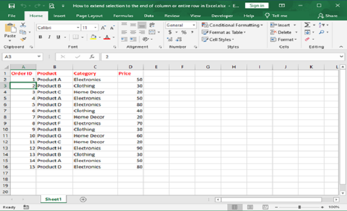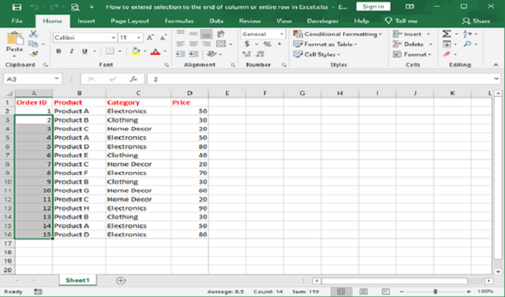 在 Excel 中將選擇擴充套件到列尾或整行的步驟