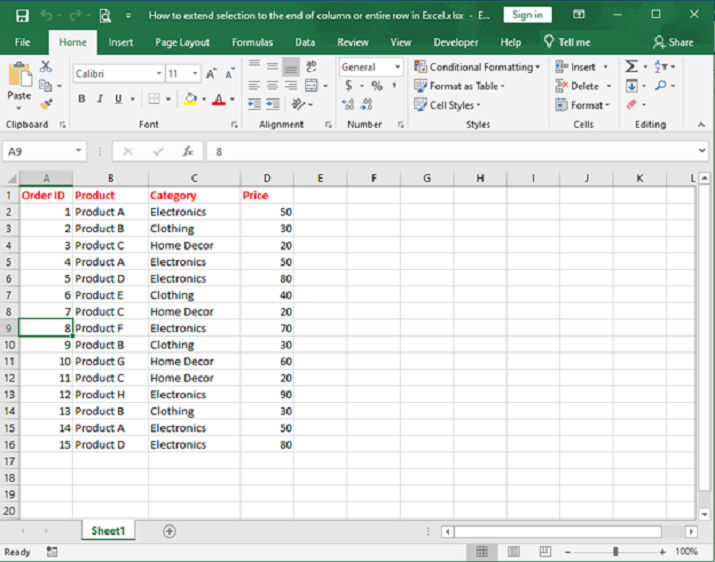 點選您要開始選擇的單元格。在我們的例子中,選擇了 A9。