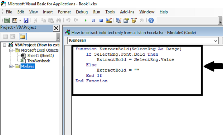 步驟2:在Microsoft Visual Basic for Applications視窗中,單擊插入->模組,在Module1中輸入以下程式碼。在此步驟中,我們定義了一個新的函式“ExtractBold”。