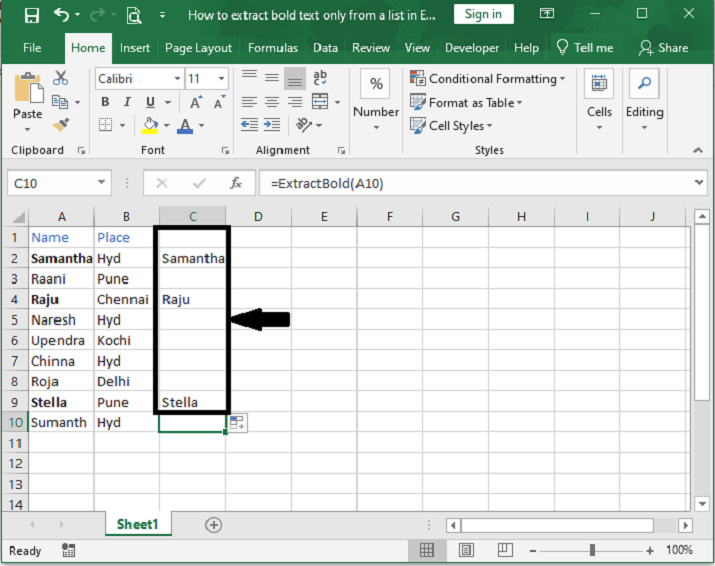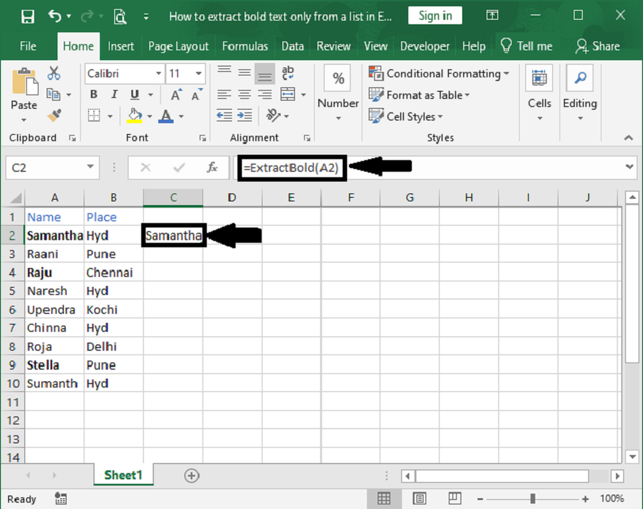 步驟3:現在,要僅從列表中提取粗體文字,請單擊空單元格(在我們的例子中為單元格C2),然後按Enter鍵輸入公式 =ExtractBold(A2) 以獲取結果。