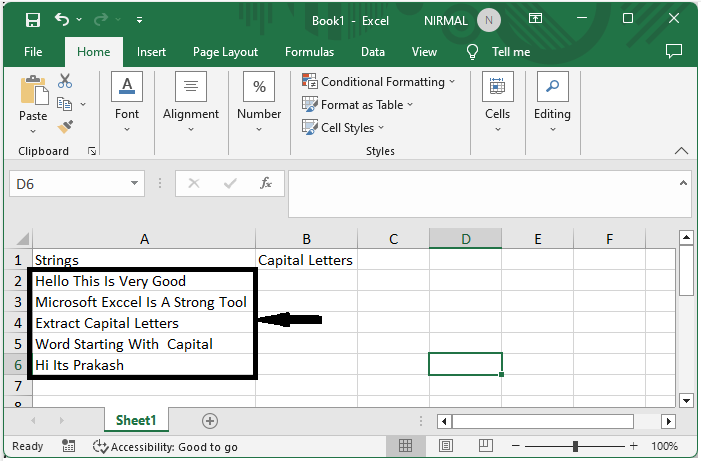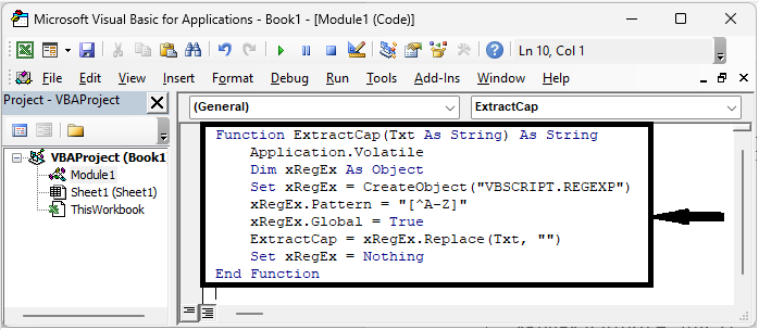 這裡,我們將首先使用VBA建立一個使用者自定義公式,然後使用該公式來完成任務。讓我們來看一個簡單的過程,瞭解如何在Excel中從文字字串中提取大寫字母或以大寫字母開頭的單詞。