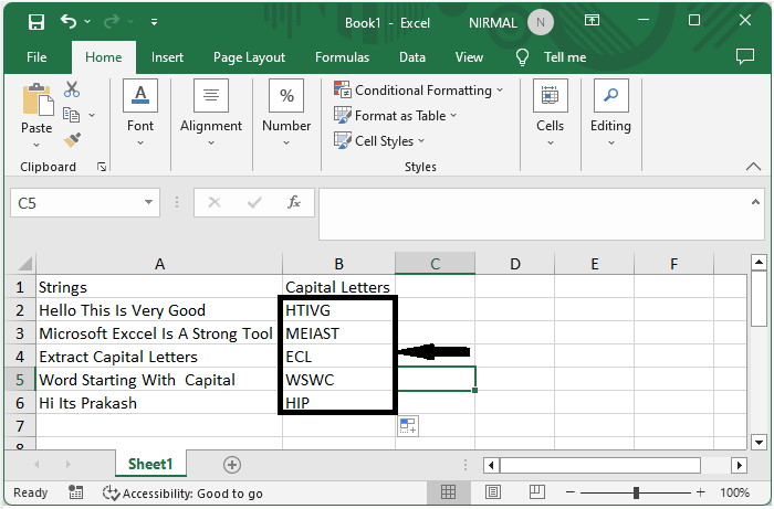 然後在Excel中,單擊一個空單元格,輸入公式`=EXTRACTCAP(A2)`,然後單擊回車鍵以提取第一個值的大寫字母。然後使用自動填充向下拖動以完成任務。
