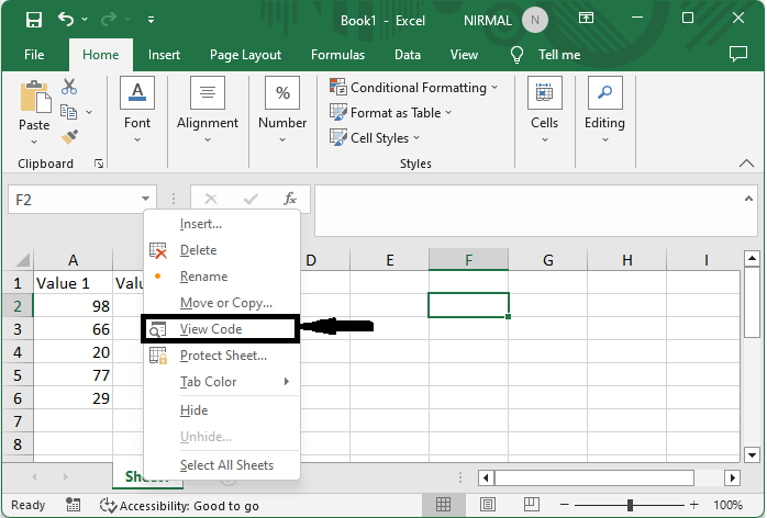 首先,右鍵單擊工作表名稱,然後選擇“檢視程式碼”以開啟VBA應用程式。