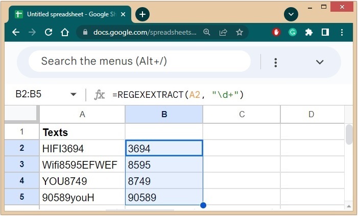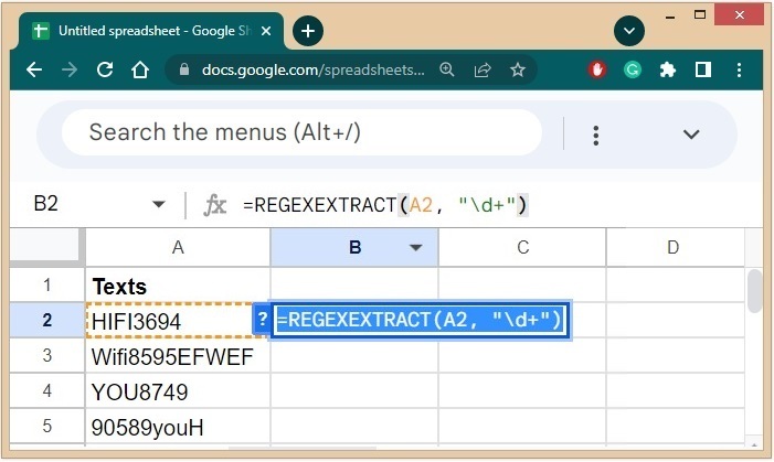 步驟 2 − 使用 REGEXEXTRACT 函式,第一個引數是第一個待處理的單元格,第二個引數是“\d+”。這表示一個或多個(由 + 表示)數字(由 d 表示)。