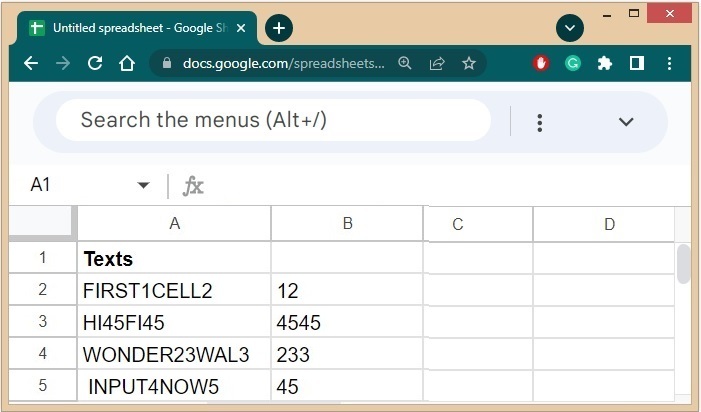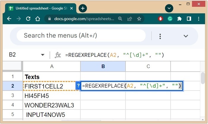 有時我們會遇到文字,其中我們有字母和數字交替的序列,其中數字會連續出現在文字的多個子序列中。在這裡,最好使用 REGEXREPLACE 函式,我們可以將非數字替換為空字串(無內容)以將其本質上刪除。