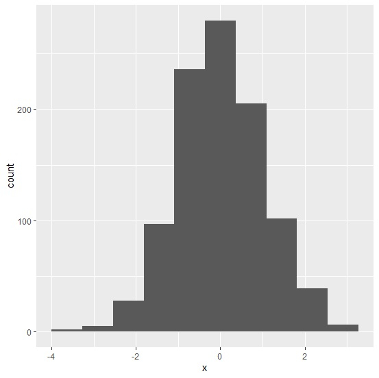 library(ggplot2) ggplot(df,aes(x))+geom_histogram(bins=10)
