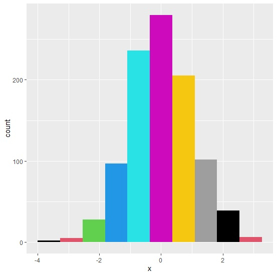 ggplot(df,aes(x))+geom_histogram(bins=10,fill=1:10)