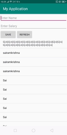 <?xml version = "1.0" encoding = "utf-8"?> <LinearLayout xmlns:android = "http://schemas.android.com/apk/res/android" xmlns:tools = "http://schemas.android.com/tools" android:layout_width = "match_parent" android:layout_height = "match_parent" tools:context = ".MainActivity" android:orientation = "vertical"> <EditText android:id = "@+id/name" android:layout_width = "match_parent" android:hint = "Enter Name" android:layout_height = "wrap_content" /> <EditText android:id = "@+id/salary" android:layout_width = "match_parent" android:inputType = "numberDecimal" android:hint = "Enter Salary" android:layout_height = "wrap_content" /> <LinearLayout android:layout_width = "wrap_content" android:layout_height = "wrap_content"><Button android:id = "@+id/save" android:text = "Save" android:layout_width = "wrap_content" android:layout_height = "wrap_content" /> <Button android:id = "@+id/refresh" android:text = "Refresh" android:layout_width = "wrap_content" android:layout_height = "wrap_content" /> <ListView android:id = "@+id/listView" android:layout_width = "match_parent" android:layout_height = "wrap_content"> </ListView> </LinearLayout>