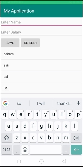 在上面的程式碼中,我們使用了名稱和薪水作為EditText,當用戶點選儲存按鈕時,它會將資料儲存到SQLite資料庫中。插入值後,點選重新整理按鈕以使用LIKE運算子從遊標更新ListView。