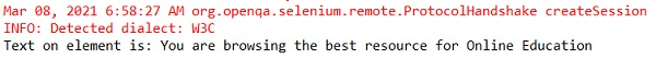 import org.openqa.selenium.By; import org.openqa.selenium.WebDriver; import org.openqa.selenium.WebElement; import org.openqa.selenium.firefox.FirefoxDriver; import java.util.concurrent.TimeUnit; public class LocatorTagName{ public static void main(String[] args) { System.setProperty("webdriver.gecko.driver", "C:\Users\ghs6kor\Desktop\Java\geckodriver.exe"); WebDriver driver = new FirefoxDriver(); //implicit wait driver.manage().timeouts().implicitlyWait(5, TimeUnit.SECONDS); //URL launch driver.get("https://tutorialspoint.tw/index.htm"); // identify element with tag name WebElement n = driver.findElement(By.tagName("h4")); //obtain text on element String s = n.getText(); System.out.println("Text on element is : " + s); driver.close(); } }