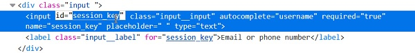 WebElement e = driver. findElement(By.id("session_key")); WebElement m = driver. findElement(By.xpath("//input[@id=' session_key']")); WebElement n = driver. findElement(By.cssSelector("input[id=' session_key']"));