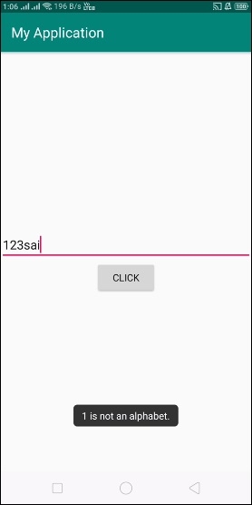 在上面的程式碼中,我們使用了 EditText 和按鈕檢視來驗證 EditText 資料是否以字母開頭。