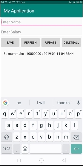 在上面的程式碼中,我們使用了名稱和薪水作為編輯文字,當用戶點選儲存按鈕時,它會將資料儲存到SQLite資料庫中。點選重新整理按鈕獲取列表檢視。