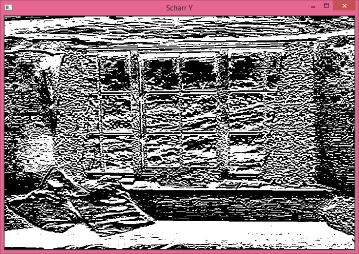 # import required libraries import cv2 # read the input image as a grayscale image img = cv2.imread('window.jpg',0) # compute the 1st order Sobel derivative in x direction scharrx = cv2.Scharr(img,cv2.CV_64F,1,0) # compute the 1st order Sobel derivative in y direction scharry = cv2.Scharr(img,cv2.CV_64F,0,1) # display scharrx and scharry cv2.imshow("Scharr X", scharrx) cv2.waitKey(0) cv2.imshow("Scharr Y", scharry) cv2.waitKey(0) cv2.destroyAllWindows()