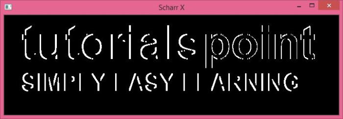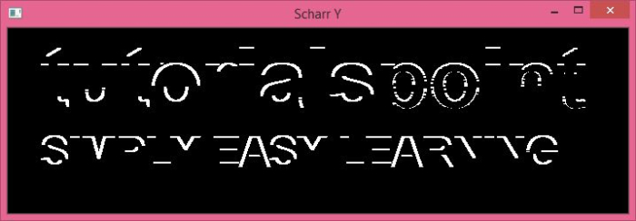 # import required libraries import cv2 # read the input image as a grayscale image img = cv2.imread('tutorialspoint.png',0) # compute the 1st order Sobel derivative in x direction scharrx = cv2.Scharr(img,cv2.CV_64F,1,0) # compute the 1st order Sobel derivative in y direction scharry = cv2.Scharr(img,cv2.CV_64F,0,1) # display scharrx and scharry cv2.imshow("Scharr X", scharrx) cv2.waitKey(0) cv2.imshow("Scharr Y", scharry) cv2.waitKey(0) cv2.destroyAllWindows()