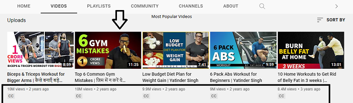 讓我們進入**Yatinder Singh**的 YouTube 頻道。然後,選擇其頻道上的“**影片**”選項,並按**最受歡迎**排序(如圖片所示)。