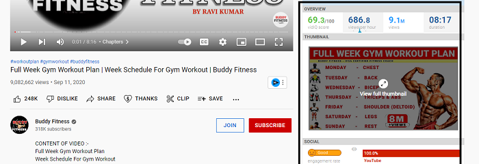 您可以將 VidIQ 擴充套件工具用於任何 YouTube 影片。例如,讓我們檢查一下**Buddy Fitness** YouTube 頻道的一個影片的 VidIQ 工具統計資料。