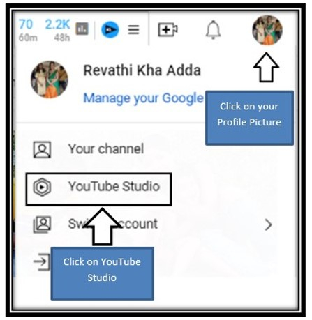 步驟 1 - 登入你的 YouTube 帳戶。點選螢幕右上角的個人資料圖示,然後從下拉選單中點選 YouTube Studio。