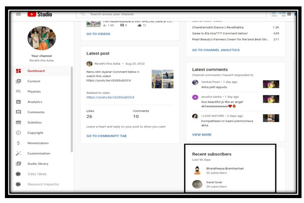 步驟 2 - 你將被帶到頻道儀表板頁面。在右下角,你會找到過去 90 天內最近訂閱者的列表。