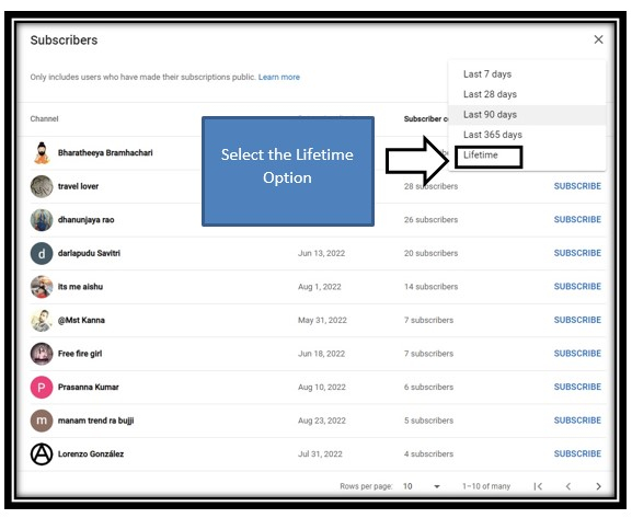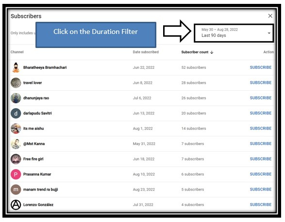 步驟 6 - 你會看到自建立頻道以來的訂閱者列表,並可從此列表中檢視關注你頻道的頂級訂閱者。點選“時長篩選器”,選擇“全部時間”選項。