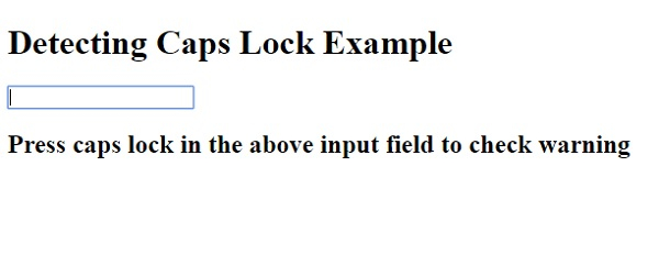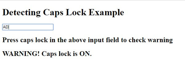 為了找出如何使用 JavaScript 讓輸入欄位中 CapsLock 開啟,程式碼如下 −