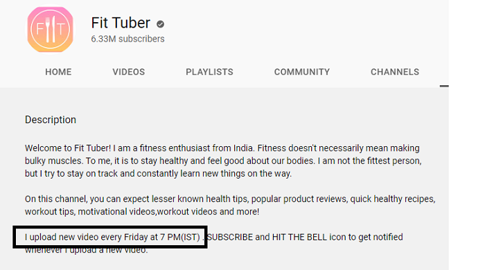 例如,Fit Tuber YouTube 頻道在其關於頁面上明確說明他們的影片將在每週五晚上 7:00 釋出。