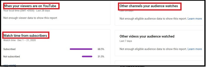 2020 年 5 月,YouTube 推出了“您的觀眾何時在 YouTube 上”功能,以幫助 YouTuber 找到釋出影片的最佳日期和時間。此報告不適用於觀看次數不多的頻道。在這種情況下,創作者必須依靠 YouTube Studio 分析為流量很少或沒有流量的頻道提供的常規研究和資料。