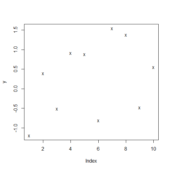 x<-rnorm(10) y<-rnorm(10,500,35) plot(x,y)