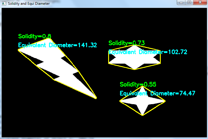 area = cv2.contourArea(cnt) hull = cv2.convexHull(cnt) hull_area = cv2.contourArea(hull) solidity = float(area)/hull_area equi_diameter = np.sqrt(4*area/np.pi)