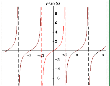 現在我們將看到正切函式的圖形,並在圖形上觀察上述值。對於零角度,值為零,然後直到角度達到90度,值為未定義。然後,直到180度,我們將得到第四象限的映象。