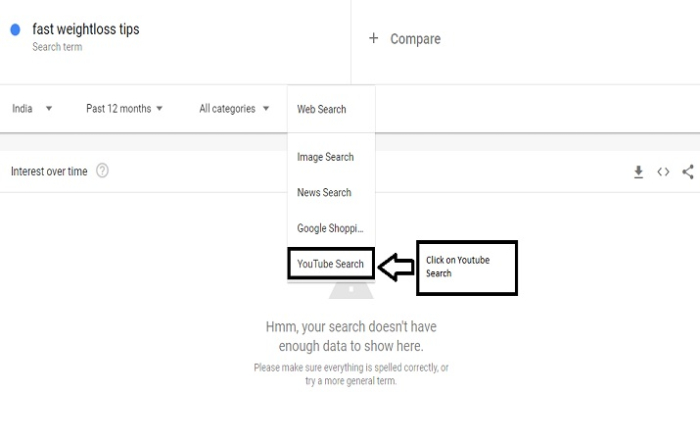 步驟 2 - 從頂行選項卡中選擇區域、時間範圍、類別和 YouTube 作為搜尋型別。(如下所示)