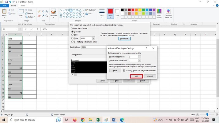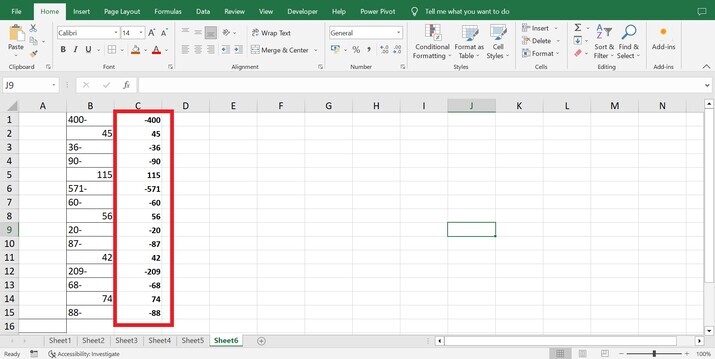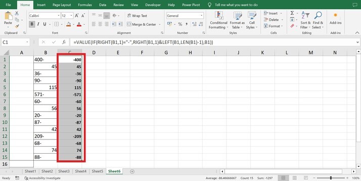 點選“完成”按鈕後,所有尾隨負號都將被修復,如下圖所示。