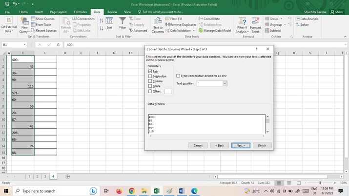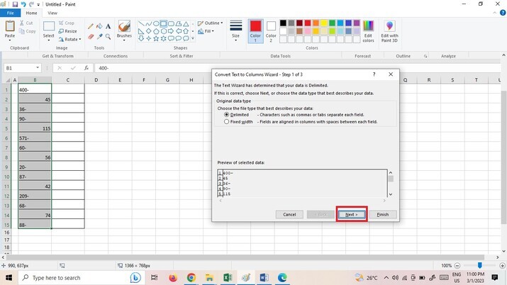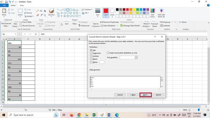 點選**“文字到列”**選項後,將顯示一個對話方塊,然後點選“下一步”按鈕,如下圖所示。