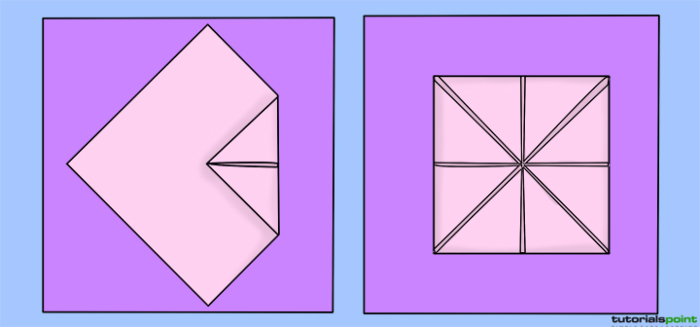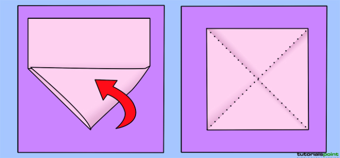 將紙張裁剪成正方形後,你需要將其摺疊成三角形。為此,將紙張的四個角都摺疊到中心。檢查摺疊是否正確。